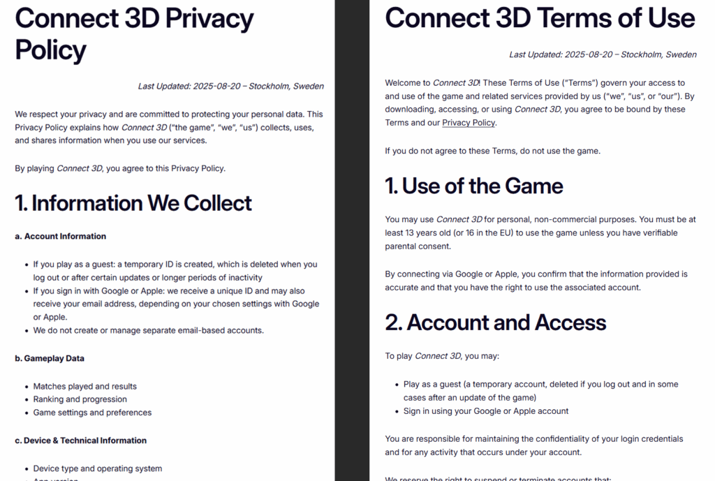 - Wrote a Privacy Policy and a terms of use and added those to the web and to the game.